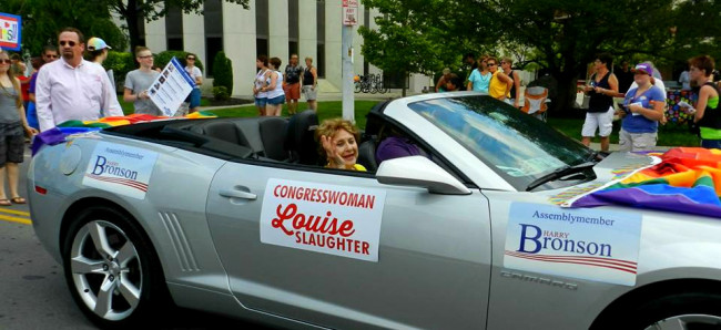 Happy Monday, everyone. And happy Pride Month, which got underway while we were off. That's why we're only now bringing you this photo of the congresswoman in a rainbow bunting-decorated Chevy Camaro. There's a Pride myth that, years ago, this car and Louise never stopped driving and waving for the entirety of Pride Month. Of course, it's false. This photo is from the 2015 Rochester Pride parade.