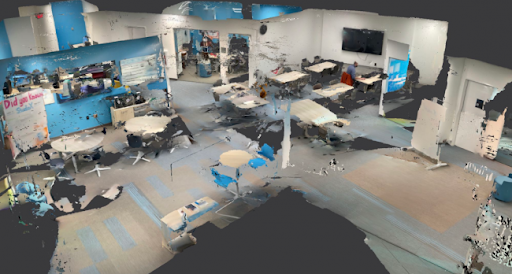 We used the Faro Laser Scanner in order to get a scan with higher accuracy and resolution. Each scan took 20 minutes, and we conducted 8 scans to cover the entire hall. The result is a 20+ GB model with billions of points. In order to load the scene to the Meta Quest 2 VR headset, we shrunk down the size and resolution of the model dramatically using tools such as gradual selection, adjusting the Poisson distribution, material paint, etc. We also deleted excessive points and replaced flat surfaces with better quality images such as the stage and mural. The end result is a nice-looking model with decent details around 250MB, good for the headset to run.