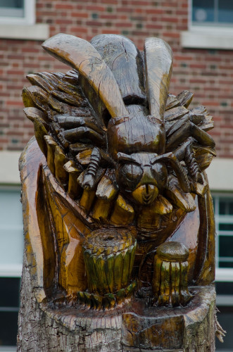 The wooden sculpture of our Yellowjacket mascot sits quietly in a corner of Wilson Commons--it took a swarm of people to tell its story.