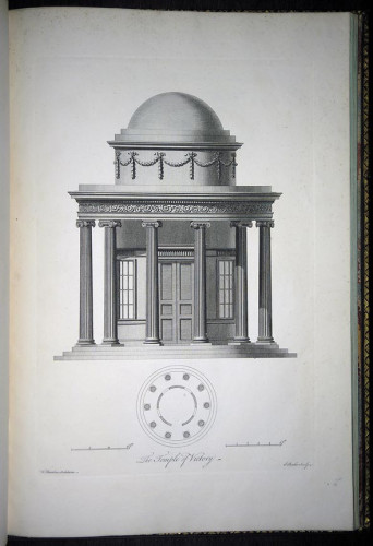Chambers's pedagogical endeavors would be materialized in an architecture handbook: A Treatise on Civil Architecture, in which The Principles of that Art are Laid down and Illustrated by a Great Number of Plates (By William Chambers. London: John Haberkorn for the Author, 1759). Likewise, an important part of his work as architect to the Royal Highnesses was compiled in our title featured this month, Plans, Elevations, Sections, and Perspective Views, which is essentially a record of Chambers's designs of more than 20 building structures built at Kew Gardens between 1757 and 1762. As it happened with A Treatise on Civil Architecture, it was commissioned and financed by George III.