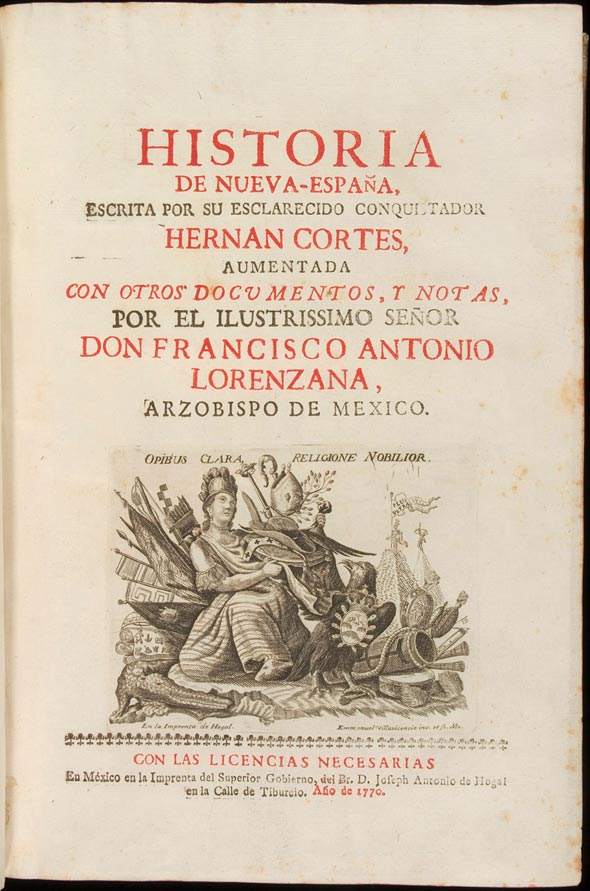 The Historia de la Nueva España was edited and published by Cardinal Francisco Antonio de Lorenzana y Buitrón (1722-1804), Archbishop of México (1766-1772), in a luxurious edition printed by José Antonio de Hogal. It was exquisitely illustrated with copperplate engravings, some of them in the form of folding maps (Johnson, 1988: 36-7). The frontispiece showing Cortés symbolically handing the New World to the king Carlos I, the map of New Spain with the journeys Cortés undertook before and after the conquest, the depiction of the El Grande Templo de Mexico, and Domingo del Castillo's map of California, were all engraved by José Mariano Navarro, an engraver and binder working in Mexico City (Donahue-Wallace, 2001: 224-9). Manuel Galicia de Villavicencio designed and engraved the Mexican Calendar and the 31 plates describing the tributes paid to the emperor Moctezuma (Donahue-Wallace, 2001: 231-4).