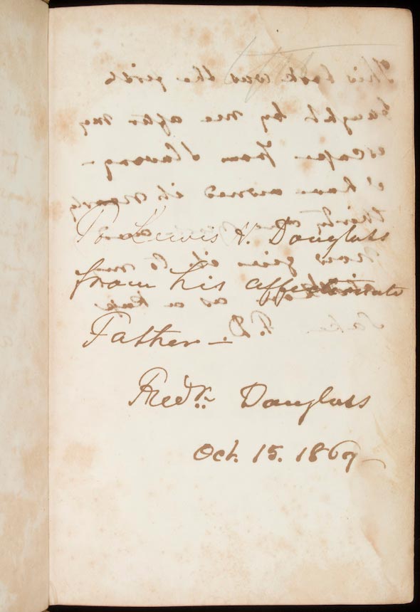 In 1867 Douglass presented this book to his son Lewis. On the flyleaf he writes: "To Lewis H. Douglass from his affectionate Father--Fredk Douglass Oct. 15. 1867." On the verso, he added, "This book was the first bought by me after my escape from slavery. I have owned it nearly thirty one years and now give it to my oldest son as a keep sake. F.D."