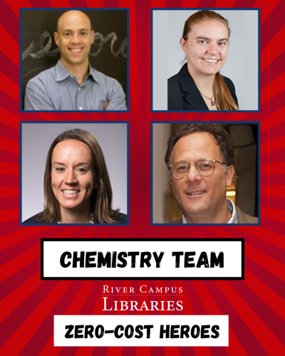 Students can save money when large lecture courses like Chemistry Concepts, Systems, and Practices (CHEM 131/132) adopt an Open Educational Resource (OER) textbook. River Campus Libraries are excited to recognize the efforts of chemistry faculty Dr. Ben Hafensteiner, Dr. Katie Knowles, Dr. Ellen Matson, and Dr. Lewis Rothberg in its latest cohort of Zero-Cost Heroes.